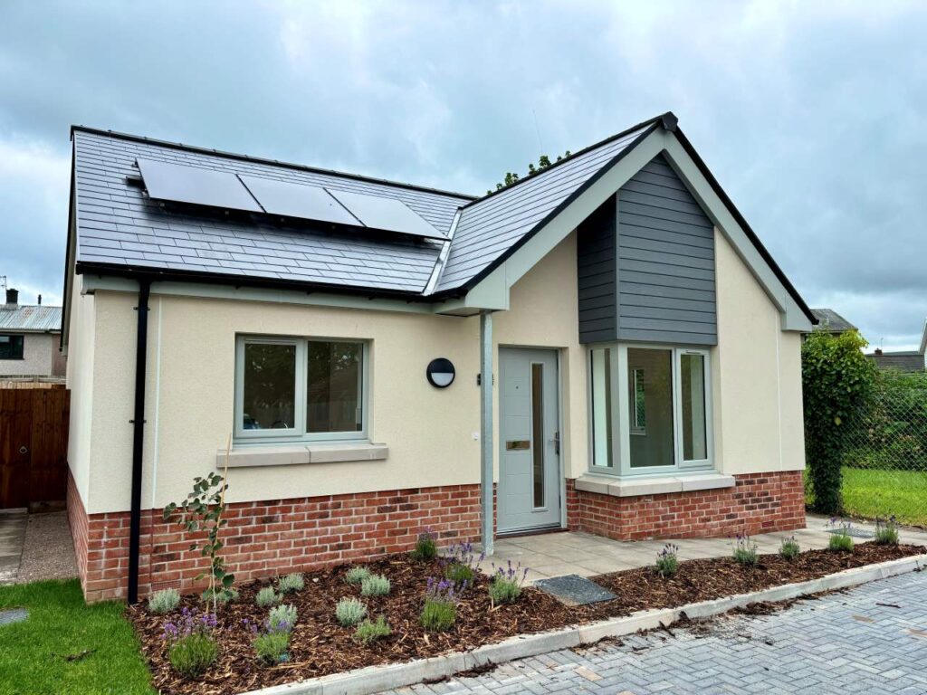 The two-bedroom bungalows have been built with high insulation and have achieved the top energy efficiency rating of EPC A. Air source heat pumps supply heating and hot water instead of gas, and solar panels on the rooves convert sunlight into electricity to power the homes, reducing the impact on the environment and lowering energy bills for residents.